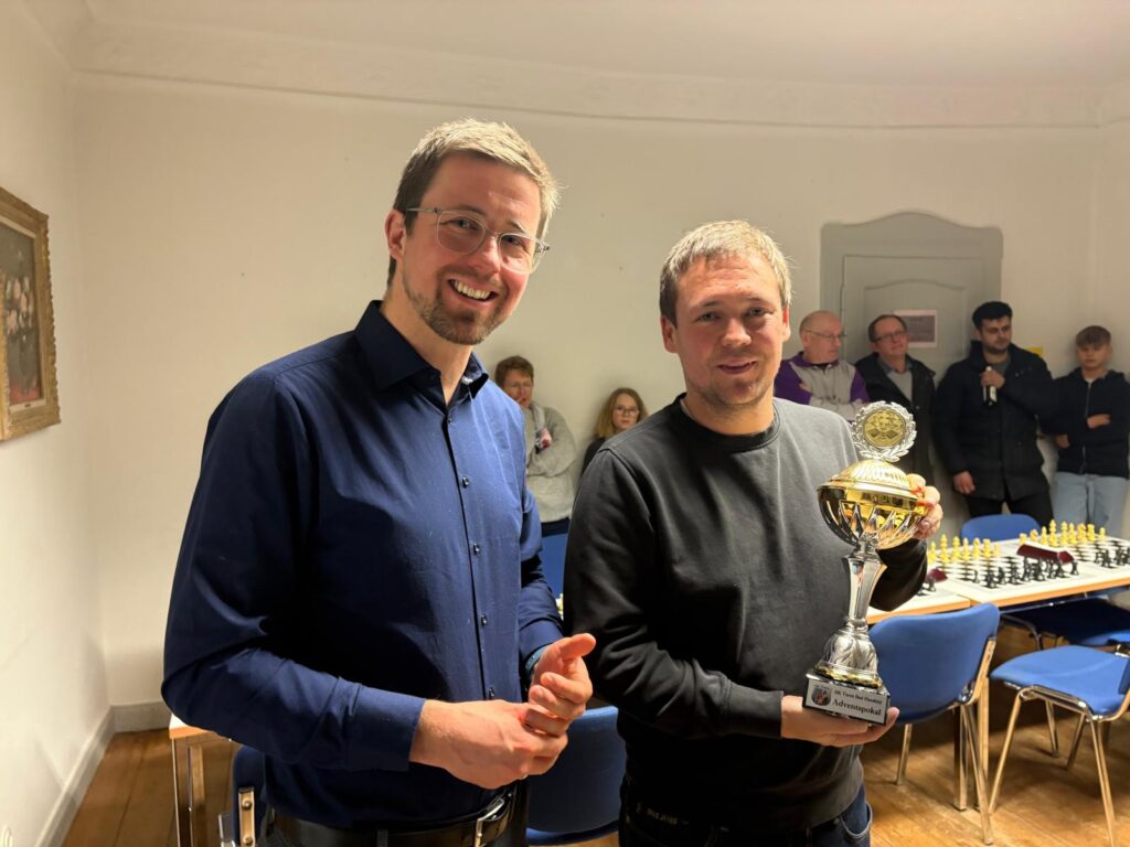 Punktgleich mit Davidov, aber mit besserer Feinwertung, sicherte sich Jona Rößing den zweiten Platz. Der Turniersieg ging in diesem Jahr souverän an Markus Schmidt, der als einer der großen Favoriten gehandelt wurde und diese Rolle eindrucksvoll bestätigte. Mit 8 Punkten aus 9 Partien blieb er ohne Niederlage – der Adventspokal bleibt somit in Hersfeld.